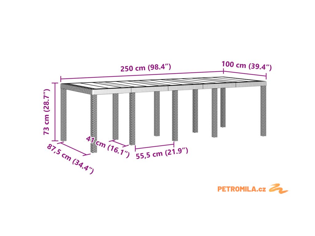 Tento elegantní moderní zahradní jídelní set spojuje elegantní současný design s praktičností, což ho činí dokonalým doplňkem venkovních prostor. Ideální pro stolování venku během letních měsíců, jeho obdélníková konfigurace podporuje rodinná shromáždění a elegantní večeře. Se zaměřením na jednoduchost a funkčnost tento set kombinuje čisté linie a minimální ozdobnost, aby vytvořil klidné venkovní prostředí.