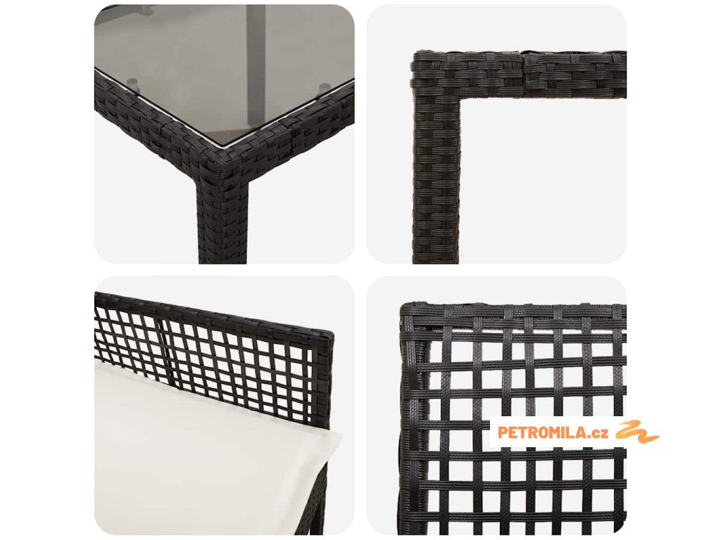- Materiály: Tato sada je vyrobená z poly ratanu, který je známý svou pevností a stylovým vzhledem. Tvrzené sklo stolu dodává moderní vibe a je odolné vůči povětrnostním podmínkám.