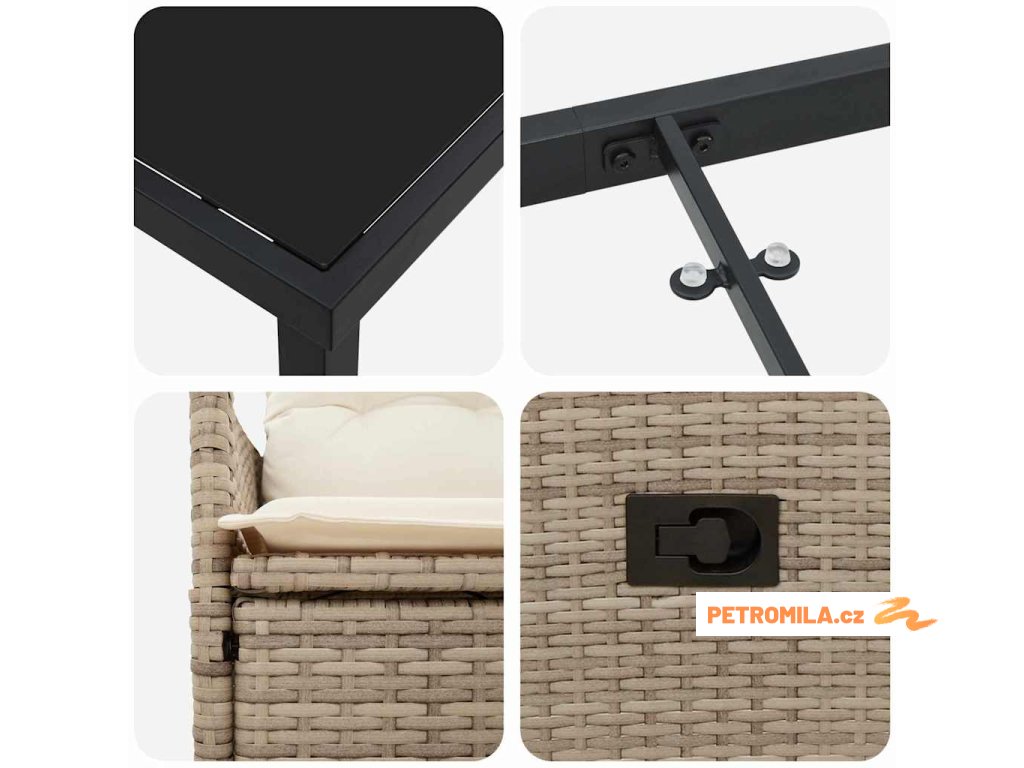 - Textura polyratanu: Vyrobená z kvalitního polyratanu, tahle souprava má tkaný povrch, který je stylový a odolný vůči UV záření a vodě. Pevný materiál zaručuje, že vypadá dobře, bez ohledu na počasí.