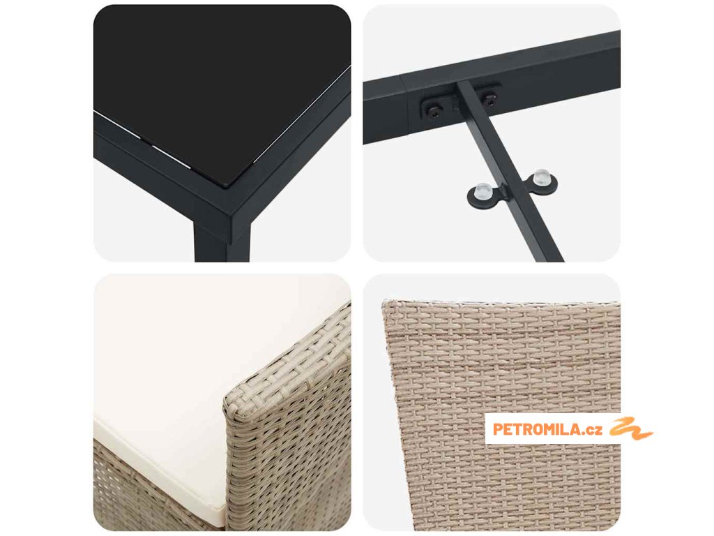 - Součásti: Obsahuje praktickou tvrzenou skleněnou desku, která je dostatečně pevná na drinky a občerstvení. Venkovní polštáře jsou z voděodolného materiálu a každý má zip pro snadné čištění.