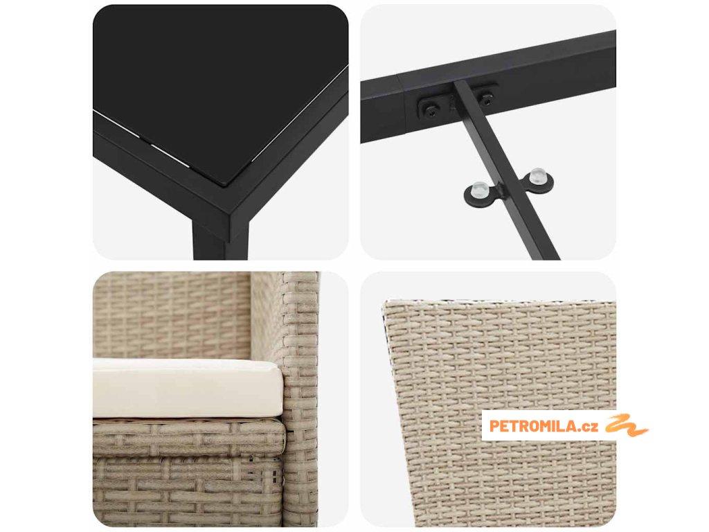 - Součásti: Obsahuje praktickou tvrzenou skleněnou desku, která je dostatečně pevná na drinky a občerstvení. Venkovní polštáře jsou z voděodolného materiálu a každý má zip pro snadné čištění.