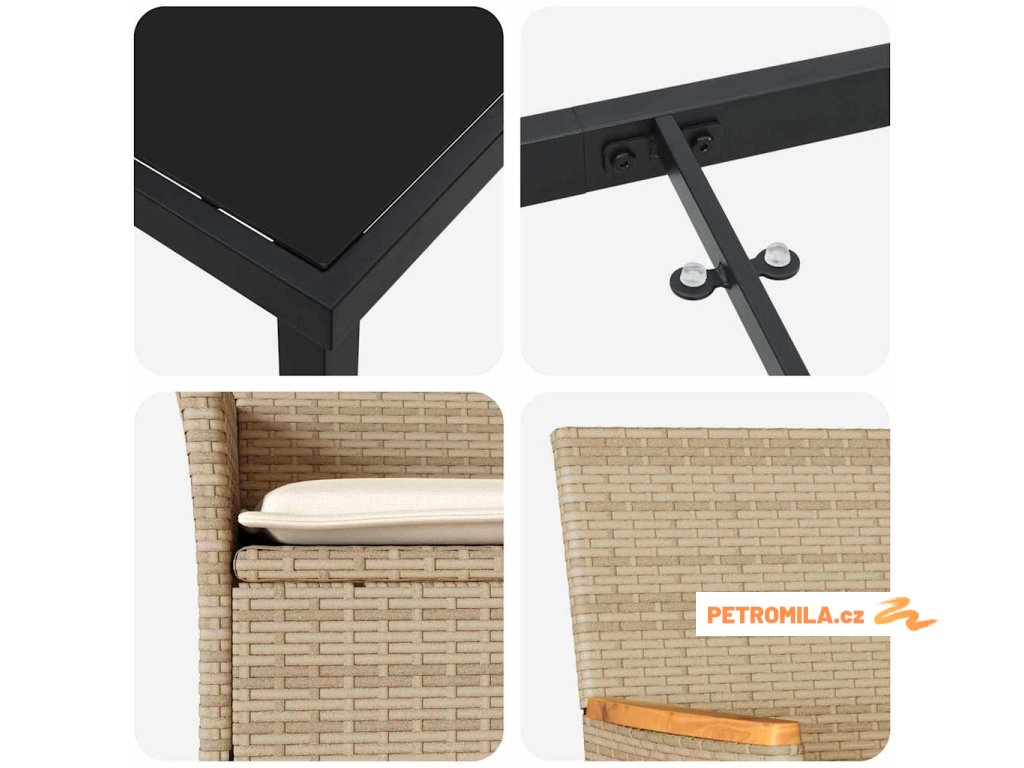 - Kompletní komponenty Set obsahuje ergonomické opěrky, ploché akáciové opěrky a stůl s tvrzeným sklem pro snadné čištění. Polštáře jsou navrženy tak, aby odolávaly různým podmínkám a přitom zvyšovaly pohodlí.