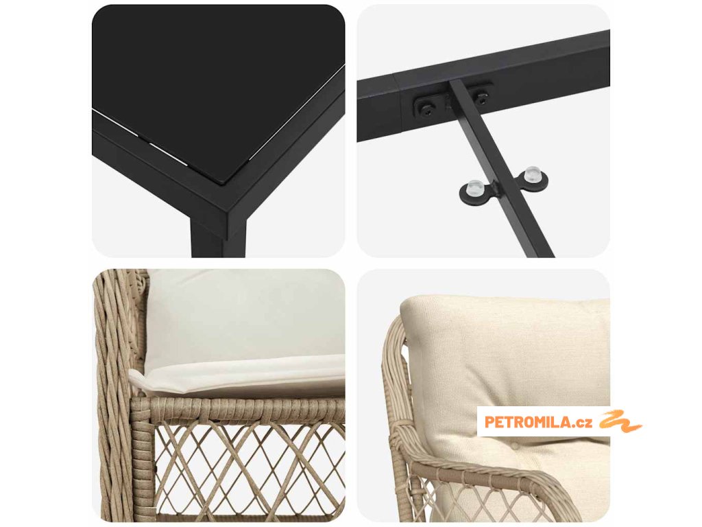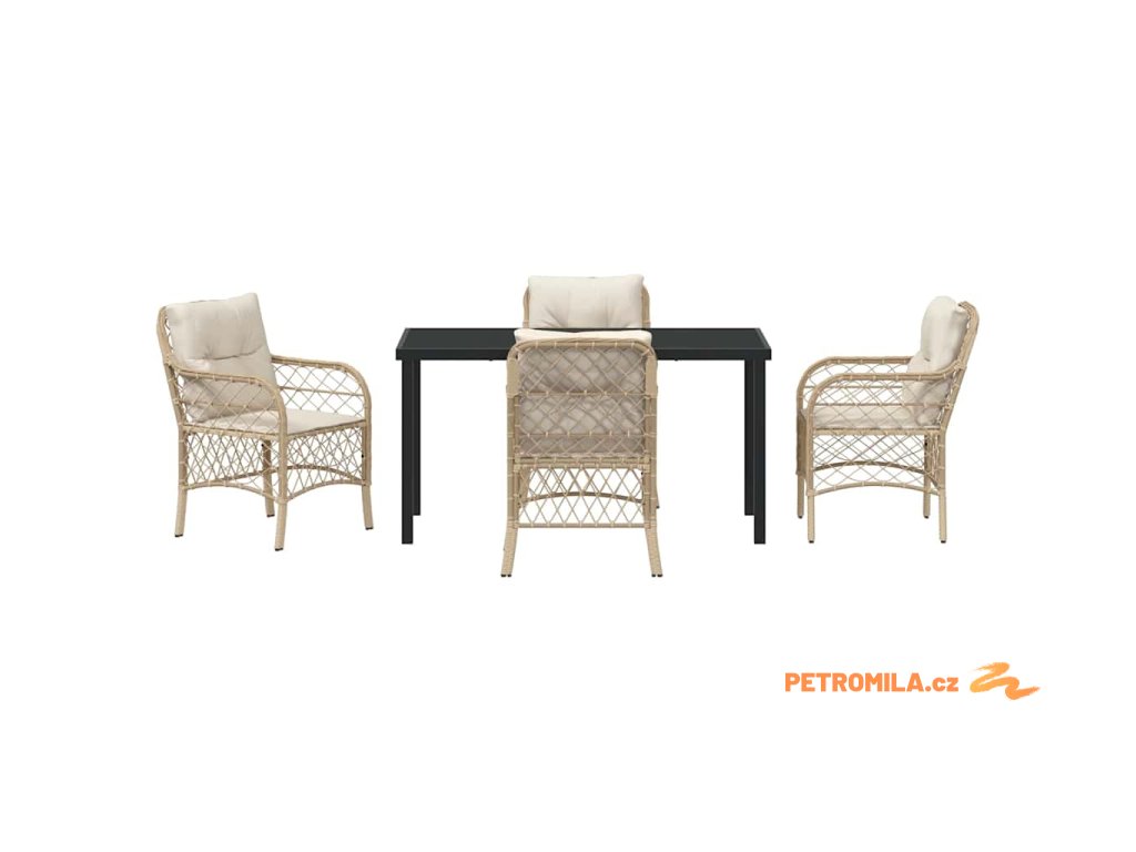 Moderní konstrukce: Vyrobeno z práškově lakované oceli a poly ratanu pro pevnost a elegantní vzhled. Tato kombinace zajišťuje, že set odolává povětrnostním vlivům, což zaručuje jeho dlouhou životnost a stylový vzhled, ideální pro venkovní akce. Pohodlná vylepšení: Obsahuje sedací polštáře vyrobené z venkovní tkaniny, která odolává povětrnostním vlivům. Polštáře mají odnímatelné potahy, což zajišťuje snadnou údržbu a čistotu. Stylový povrch z tvrzeného skla: Vkusný stůl z tvrzeného skla, který se skvěle doplňuje se štíhlým černým rámem, dodává sofistikovanost a pohodlí vaší jídelně. Snadno se čistí a vylepšuje vzhled vašeho venkovního jídelního prostoru. Jednoduchá údržba: Navržen s ohledem na snadnou údržbu, kryt chraňte, když ho nepoužíváte, abyste set ochránili před deštěm a slunečním zářením. Tím zajistíte, že set zůstane v perfektním stavu pro jakékoli nečekané zahradní večírky. Ergonomické opěrky: Promyšlené ploché poly ratanové opěrky rukou nabízejí pohodlí, ideální pro odpočinkové stolování, ať už si vychutnáváte lehké jídlo nebo slavnostní rodinné party.- Barva: Béžová