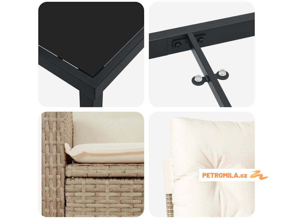 - Materiály: Set je vyrobený z poly ratanu a odolné oceli, zajišťující trvanlivost a eleganci. Poly ratan se přirozeně brání UV záření a špatnému počasí, takže je ideální na slunečné dny, a ocelový rám dodává pevnost a stabilitu pro dlouhodobé používání.