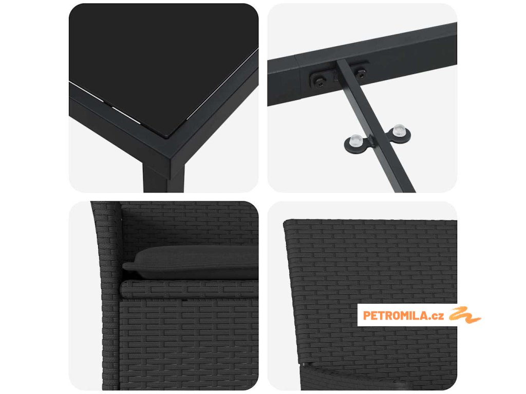 - Odolný ocelový rám: Práškově lakovaná ocel dělá soupravu silnou a stabilní pro venkovní použití. Lak se nanáší a tepelně zpracovává, takže povrch je odolný proti blednutí a odlupování, což zajišťuje dlouhou životnost soupravy.