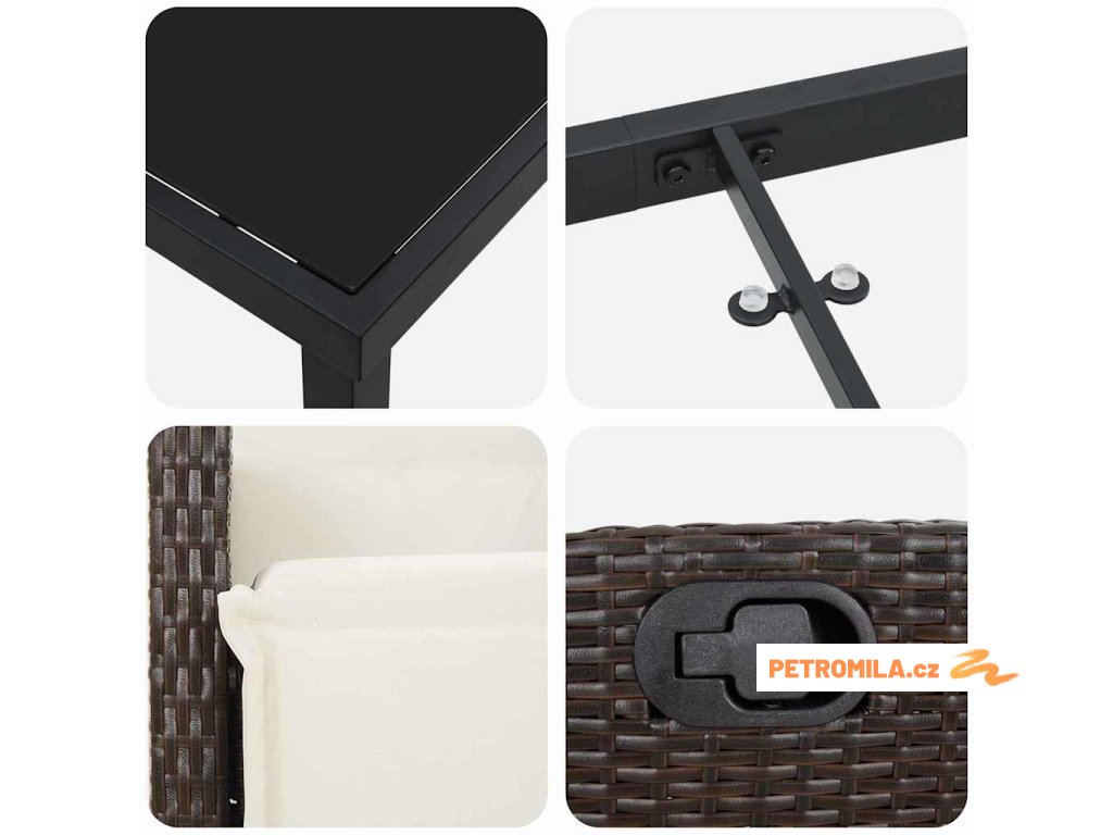 - Materiály: Set je vyroben z poly ratanu a odolné oceli. Poly ratan přináší moderní tkanou texturu, která kombinuje estetiku a odolnost, a ocelová konstrukce zajišťuje stabilitu a výdrž během proměn počasí.