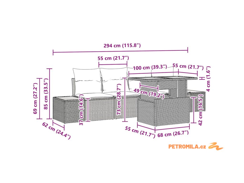 - Vlastnosti / Funkce / Design: Modulární design setu umožňuje přizpůsobitelné konfigurace, které se přizpůsobují různým tvarům a velikostem teras. Nastavitelné nožičky pomáhají vyrovnat nábytek na nerovných plochách a zároveň zajišťují stabilitu. S odnímatelnými a zipovými potahy na sedáky se údržba a čištění stanou snadnými.