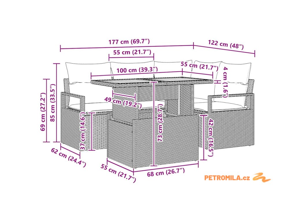 - Sezení: Každá sedací jednotka disponuje měkkými polyesterovými polštáři plněnými lehkou pěnou, s bezpečným zipem pro snadné sejmutí a čištění. Čtvercové opěrky rukou poskytují podporu a styl, zvyšující komfort během delšího používání.