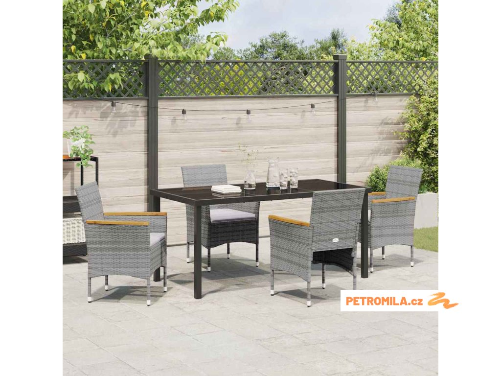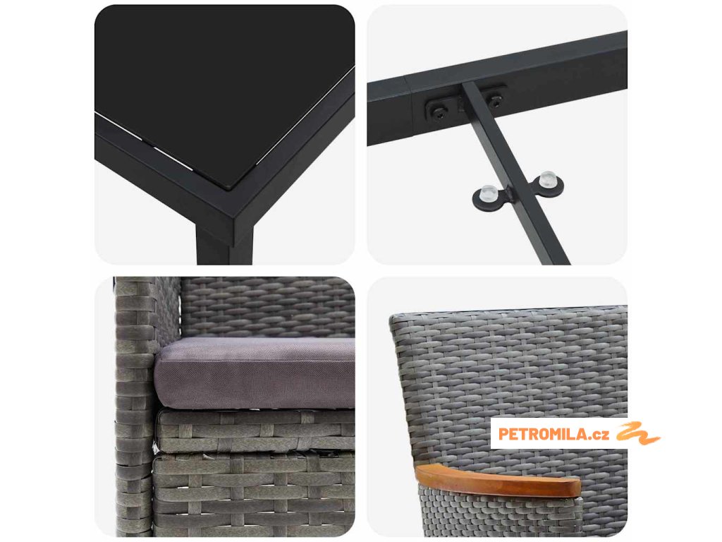 - Materiály: Tento set je vyrobený z trvanlivého poly ratanu, co odolává slunci, a rám z práškované oceli mu dodává na dlouhé životnosti. Povrch z tvrzeného skla je hladký a odolný proti škrábancům, takže vypadá stále stylish.