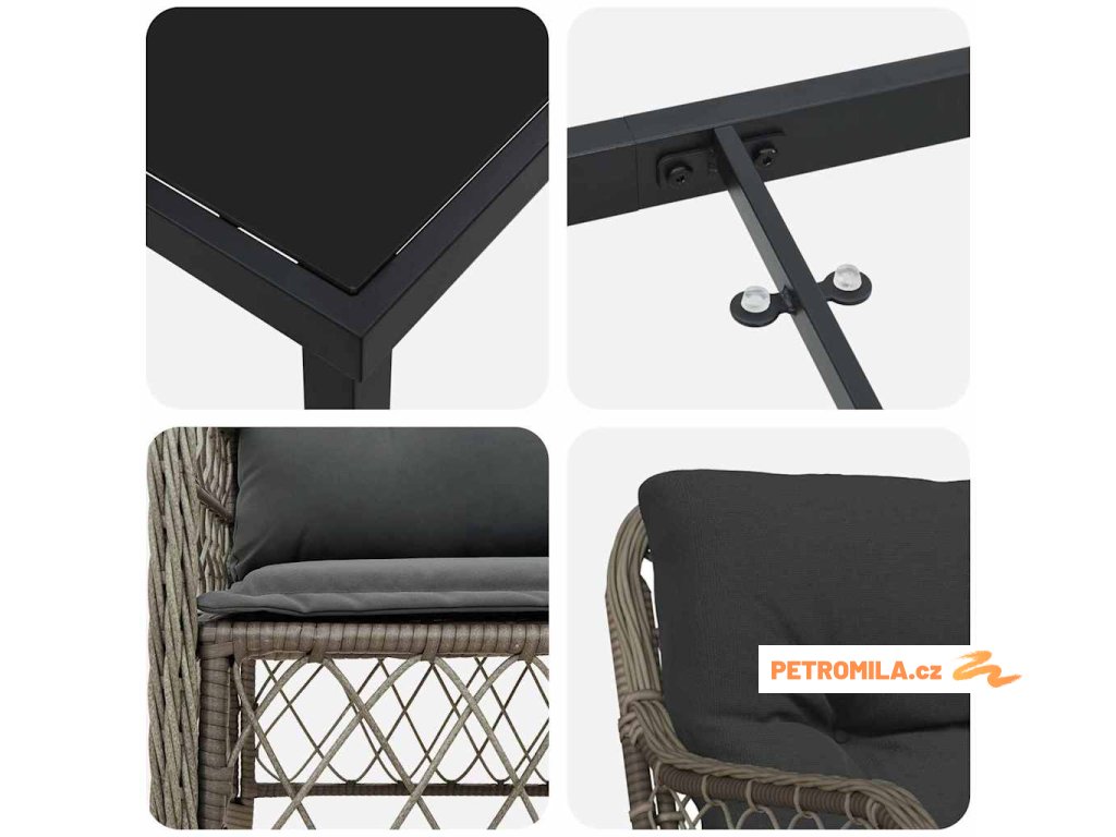 Moderní konstrukce: Vyrobeno z práškově lakované oceli a poly ratanu pro pevnost a elegantní vzhled. Tato kombinace zajišťuje, že set odolává povětrnostním vlivům, což zaručuje jeho dlouhou životnost a stylový vzhled, ideální pro venkovní akce. Pohodlná vylepšení: Obsahuje sedací polštáře vyrobené z venkovní tkaniny, která odolává povětrnostním vlivům. Polštáře mají odnímatelné potahy, což zajišťuje snadnou údržbu a čistotu. Stylový povrch z tvrzeného skla: Vkusný stůl z tvrzeného skla, který se skvěle doplňuje se štíhlým černým rámem, dodává sofistikovanost a pohodlí vaší jídelně. Snadno se čistí a vylepšuje vzhled vašeho venkovního jídelního prostoru. Jednoduchá údržba: Navržen s ohledem na snadnou údržbu, kryt chraňte, když ho nepoužíváte, abyste set ochránili před deštěm a slunečním zářením. Tím zajistíte, že set zůstane v perfektním stavu pro jakékoli nečekané zahradní večírky. Ergonomické opěrky: Promyšlené ploché poly ratanové opěrky rukou nabízejí pohodlí, ideální pro odpočinkové stolování, ať už si vychutnáváte lehké jídlo nebo slavnostní rodinné party.- Barva: Šedá