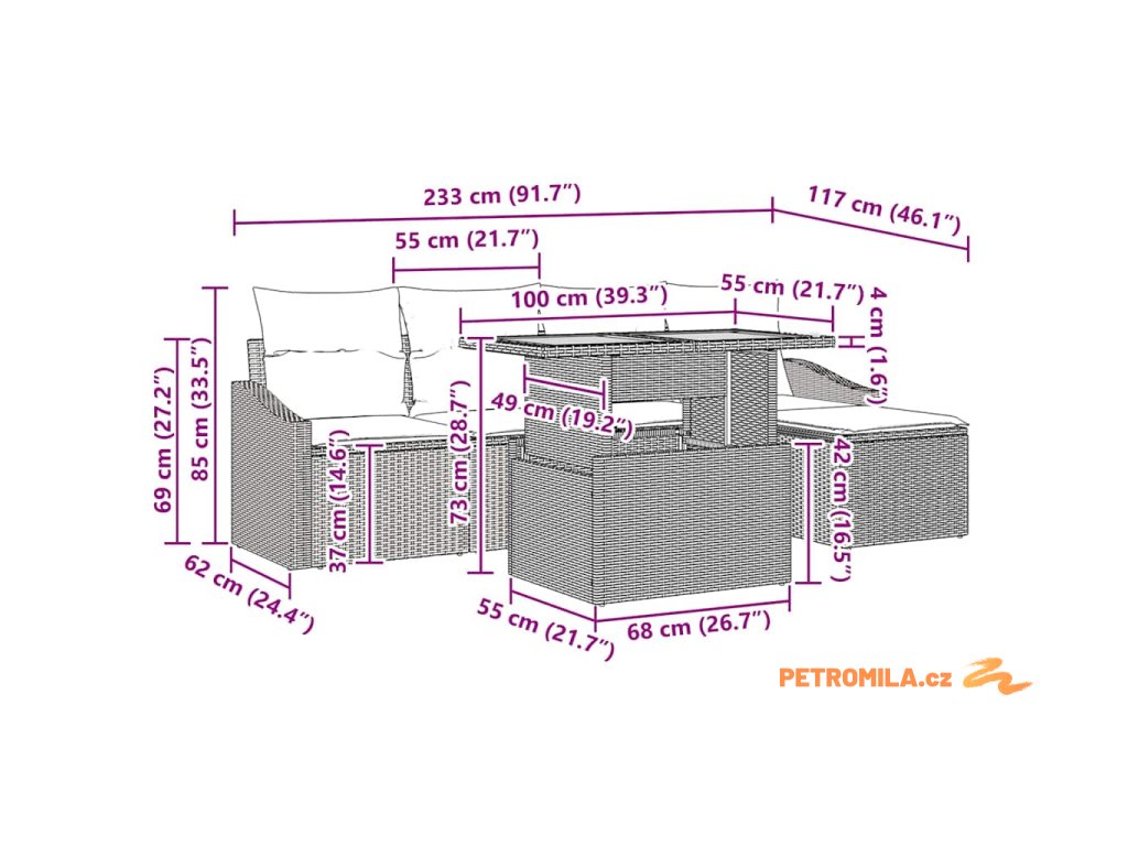 - Nastavitelnost a univerzálnost: Různé části lze manuálně přizpůsobit. S modulárními sekcemi, které lze přeskupit, si můžete snadno uspořádat venkovní prostor podle svých aktivit a shromáždění.