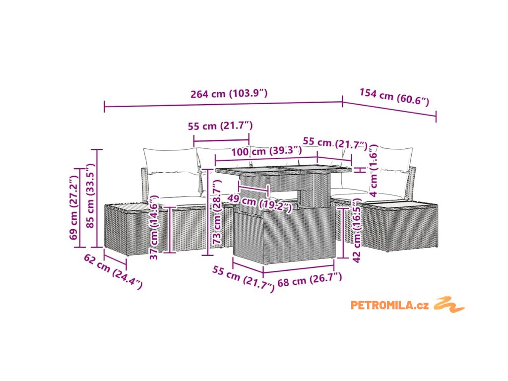 - Užitečné funkce: Díky modulárnímu stylu a nastavitelným nohám se set přizpůsobuje různým příležitostem, takže si ho můžeš uspořádat podle sebe. To přináší více komfortu a praktického využití, což ho dělá skvělou volbou pro různé venkovní prostory. Aby to bylo lepší, polštáře mají zipy, takže se dají snadno vyčistit.
