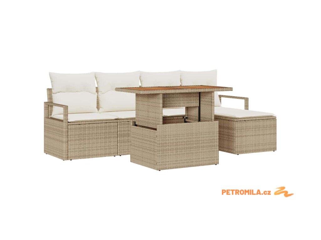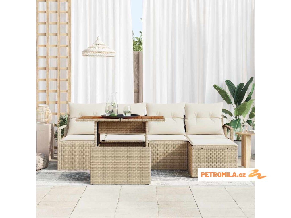 - Materiály: Sedací set je z prvotřídního polyratanu, oceli a masivního akáciového dřeva, takže vypadá skvěle a vydrží. Tkaný polyratan dodává umělecký šmrnc, zatímco masivní akáciové dřevo přináší přírodní krásu. Tato kombinace zajišťuje, že zvládne venkovní počasí, udrží si dobrý vzhled i na slunci a za deště.