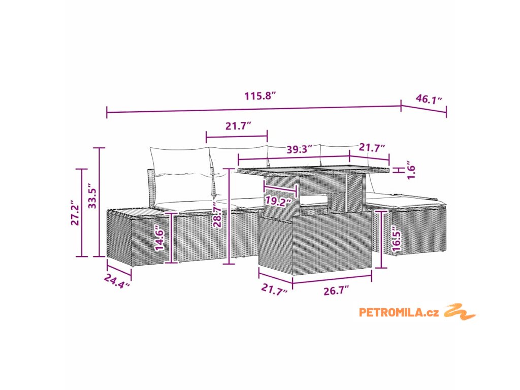 - Functional Components: Tento set obsahuje boční pohovku, centrální sedadla, taburet a zahradní stůl, všechny s vestavěným úložným prostorem. Tento multifunkční design poskytuje praktické využití pro další věci, udržujíc přitom prostor uklizený a organizovaný bez kompromisů ve stylu.