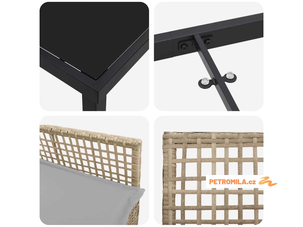 - Kompletní set: Obsahuje vše potřebné včetně stabilního skleněného stolu, pohodlných polštářů z poly ratanu a pevných nohou. Každý prvek je funkční, spojuje komfort a praktičnost pro bezproblémové venkovní aktivity. Set dělá z venkovního stolování příjemný zážitek a je ideální pro rodinná jídla nebo večírky s přáteli.