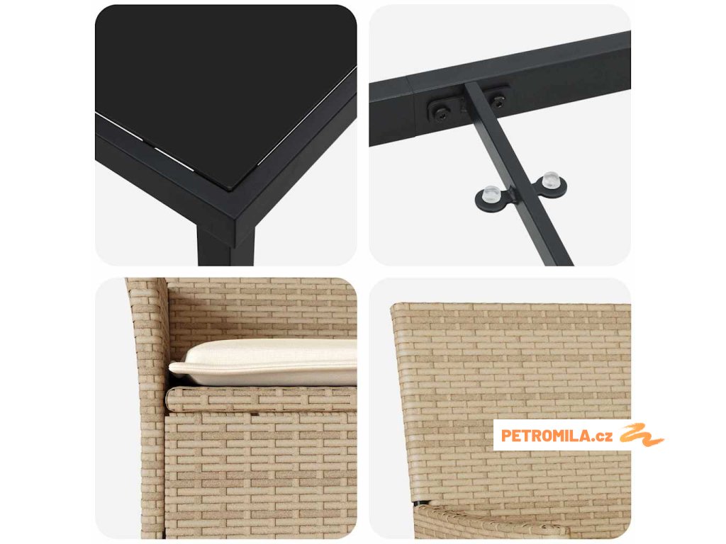 - Tkaný polyratan: Souprava je vyrobená z jemně tkaného polyratanu, který dodává eleganci a zajišťuje odolnost. Je odolný vůči UV záření a počasí, díky čemuž souprava vypadá skvěle i po delší době venku.