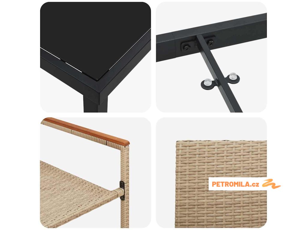 - Materiály: Tenhle set je z odolného poly ratanu, který skvěle doplňuje venkovní prostředí. Tvrzené sklo na stole je snadno čistitelné a vypadá super.