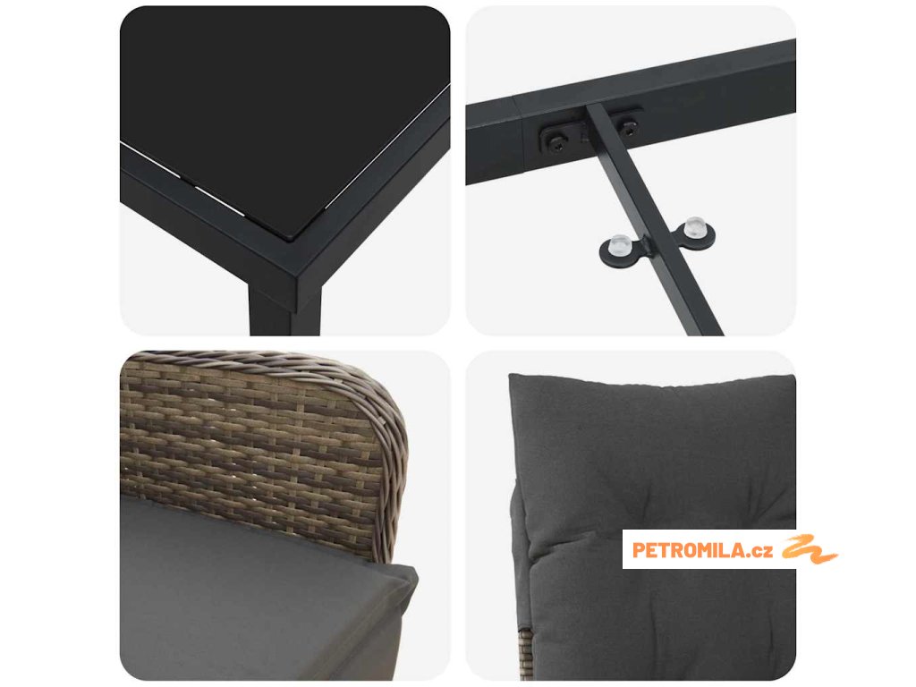 - Vysoce kvalitní materiály: Na výrobu setu byly použity poly ratan, tvrzené sklo a práškově lakovaná ocel. Tento set spojuje styl s odolností. Poly ratan navíc chrání proti UV záření, což prodlužuje dobu jeho atraktivity a funkčnosti. Práškově lakovaná ocel přináší pevnou oporu pro venkovní použití.
