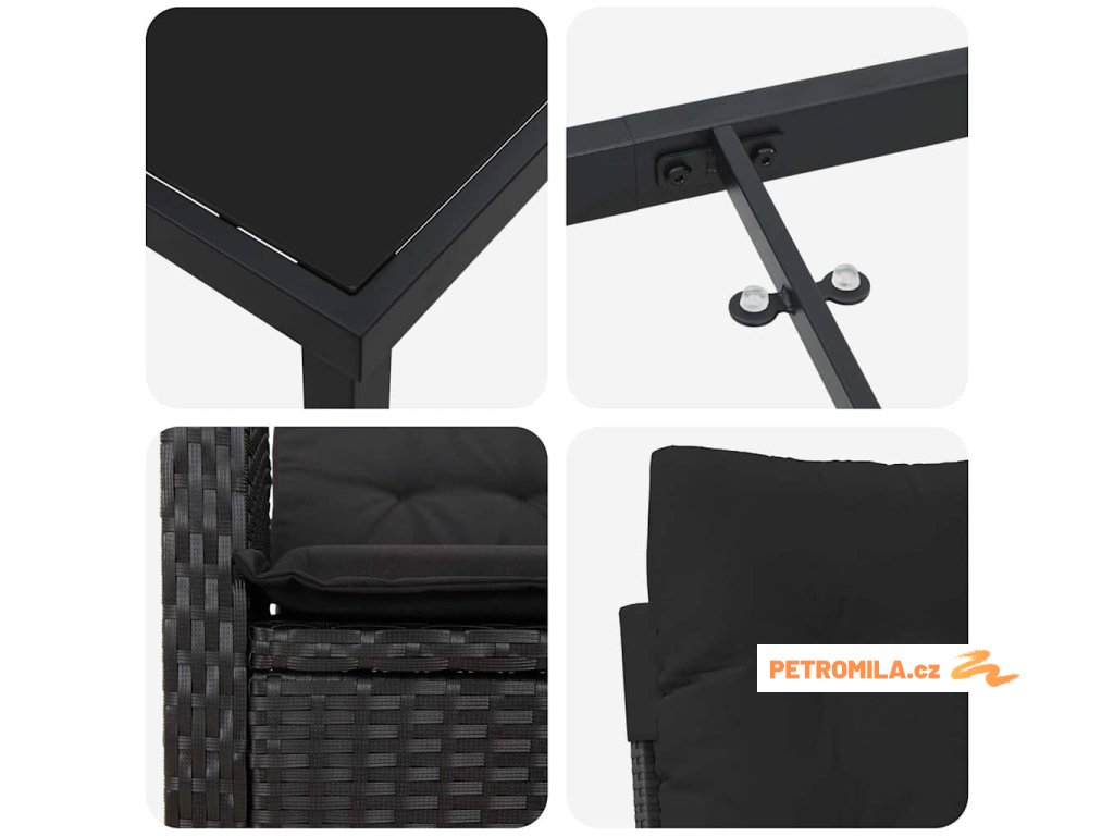• Materiály: Set je vyrobený z poly ratanu a odolné oceli, zajišťující trvanlivost a eleganci. Poly ratan se přirozeně brání UV záření a špatnému počasí, takže je ideální na slunečné dny, a ocelový rám dodává pevnost a stabilitu pro dlouhodobé používání.