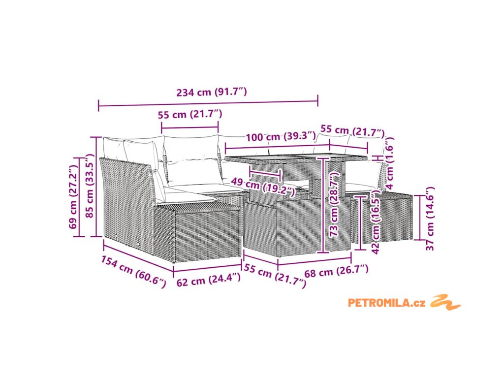 - Univerzální funkce: Vyznačující se modulárním designem, tato souprava nabízí flexibilitu změnit rozložení tak, aby vyhovovalo různým potřebám a preferencím. Nastavitelné nohy mohou vyrovnat nábytek na nerovných plochách, zajišťují stabilitu a pohodlí. Kombinace sedadla s pěnovým polstrováním a poly ratanovými opěradly zajistí ergonomickou oporu, zatímco poskytuje tepelnou a vlhkostní bariéru, což přidává k uživatelsky přívětivému designu.