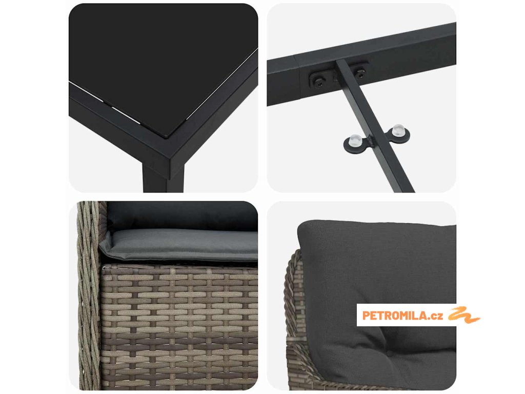 - Materiály: Set kombinuje poly ratan a práškově lakovanou ocel pro styl a odolnost. Tato kombinace dodává elegantní vzhled a je dost robustní na to, aby odolala každému počasí. Tkaná struktura poly ratanu se hezky doplňuje s ochranným nátěrem na oceli, což jí pomáhá dlouho vypadat čerstvě.