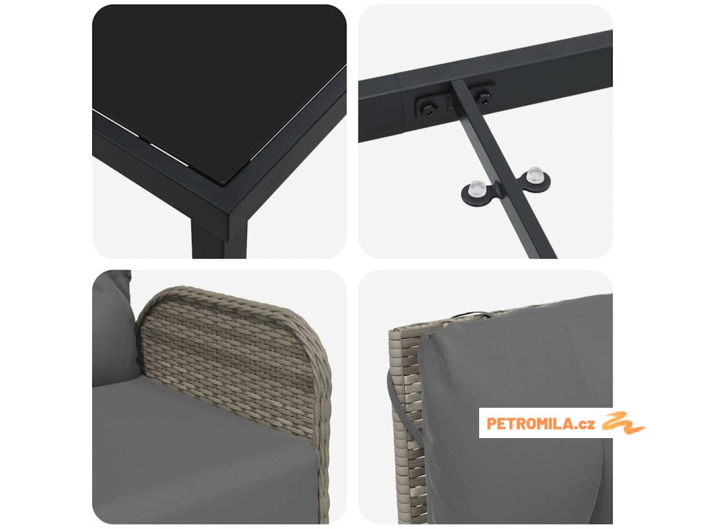 - Vysokokvalitní materiály: Z pevného polyratanu a oceli, je robustní, ale lehká, což usnadňuje přenos. Tyto materiály vypadají dobře a dodávají styl vašemu venkovnímu prostoru.