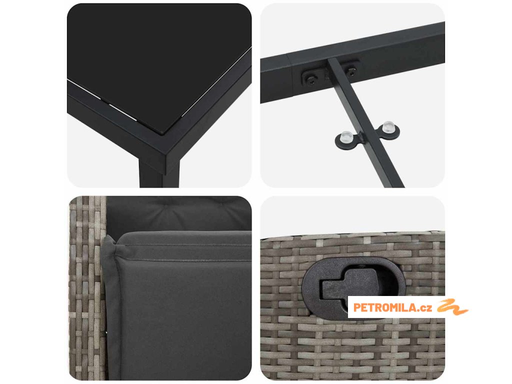 Vysoce kvalitní materiály Tento stůl a židle jsou z polyratanu a tvrzeného skla, takže jsou odolné a elegantní. Polyratan vydrží počasí, aby vypadaly skvěle po celý rok, a ocelová konstrukce dodává extra podporu. Funkční komponenty Stůl má skleněný povrch, což je skvělý prostor pro jídlo, a polyratanové opěrky a sedáky zvyšují pohodlí. Vše se skvěle doplňuje pro úžasný zážitek z jídla. Univerzální funkce Tento set má ruční polohovatelné opěradlo, což umožňuje každému si nastavit pohodlnou pozici na lenošení nebo při jídle. Usability context Perfektní pro letní grilování a odpočinek, zvedá atmosféru v zahradě a dělá terasy elegantní, ideální pro snídaně na slunci nebo útulné večeře. Údržbové tipy Pro delší životnost tohoto setu používejte kryt, když ho nepoužíváte. Tím ochráníte materiály před počasím a prodloužíte jejich životnost, údržba je tak snadná.- Barva: Šedá