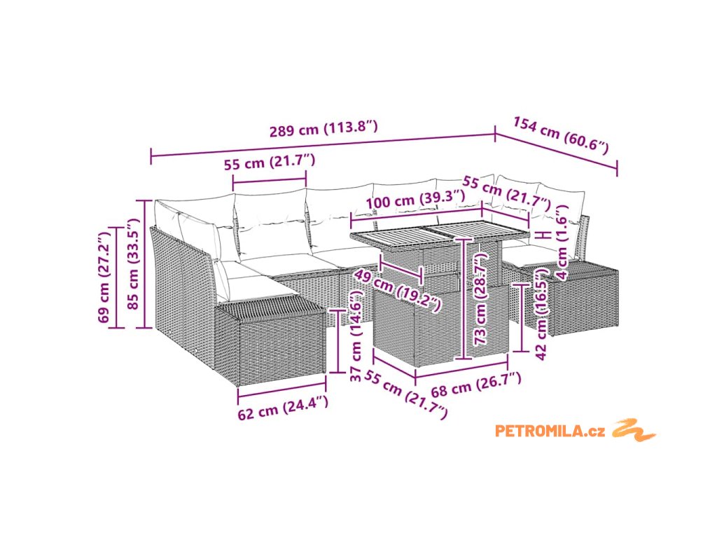 - Součásti: Sada zahrnuje dvě boční pohovky, dvě rohové sedadla a tři střední sedadla, všechny s praktickými funkcemi úložného prostoru. Odpovídající zahradní stůl dokončuje ensemble, poskytující jak pohodlí, tak funkčnost pro venkovní užití.