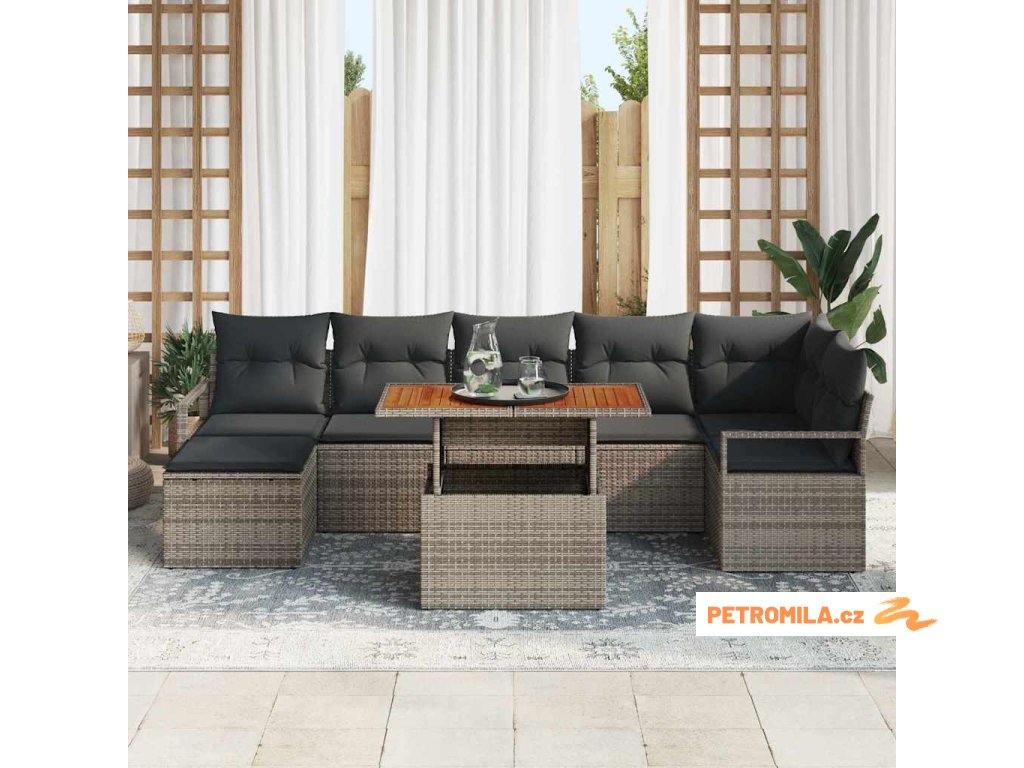 - Špičkové materiály: Vyrobený z kvalitního polyratanu, tento pohovkový set je navržen tak, aby odolal povětrnostním vlivům a UV záření, ideální pro letní použití. Odolný práškově lakovaný rám z oceli zajišťuje stabilitu a je odolný proti korozi. Pevné akáciové dřevo zvyšuje vzhled a dodává přírodní pocit, který se skvěle hodí do každé zahrady.