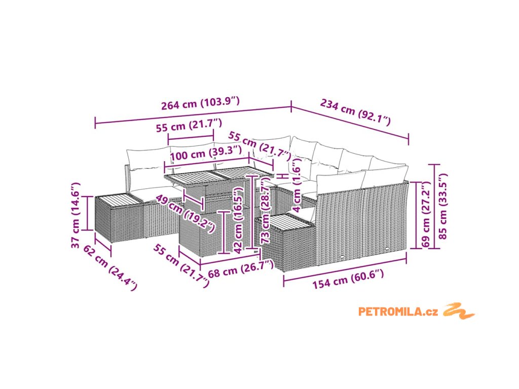 - Funkční komponenty Set je vybaven dvěma bočními pohovkami, dvěma rohovými sedacími částmi a čtyřmi centrálními sedadly, z nichž každé zahrnuje funkci úložného prostoru, což prakticky usnadňuje úsporu místa a zároveň poskytuje pohodlné sezení. Ergonomická opěrka zad, sedací polštáře a madla zajišťují pohodlí při dlouhodobém užití, zatímco odnímatelné potahy polštářů přidávají praktičnost pro čištění a údržbu.
