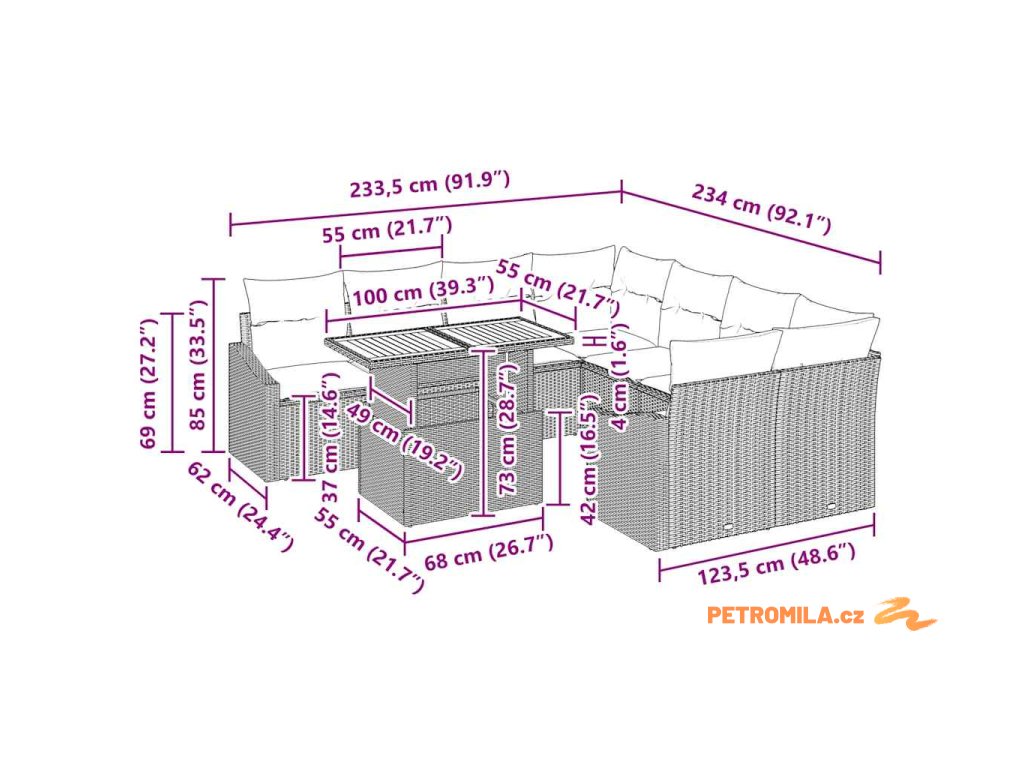 - Úložná funkčnost: Pečlivě navrženo s integrovanými úložnými prostory v područkách, rohových a středových sedadlech, nabízí praktické řešení pro organizaci polštářů a dalších nezbytností. Tato funkce přidává pohodlí, což činí ideální pro uklizené venkovní prostory.