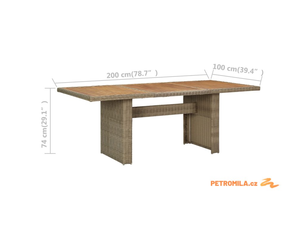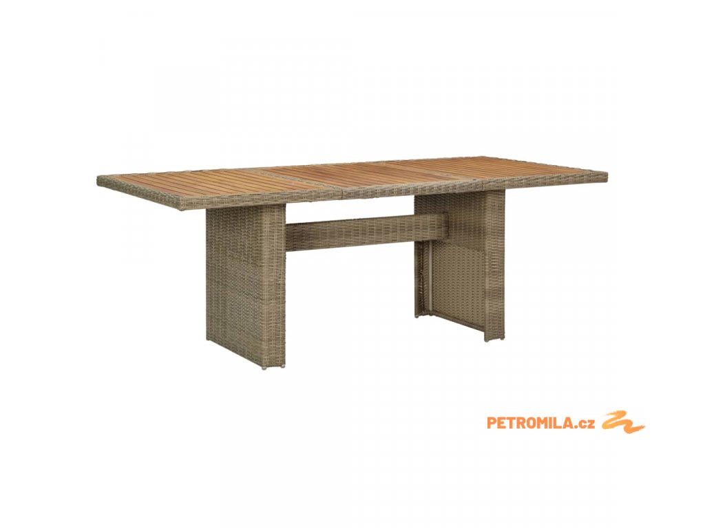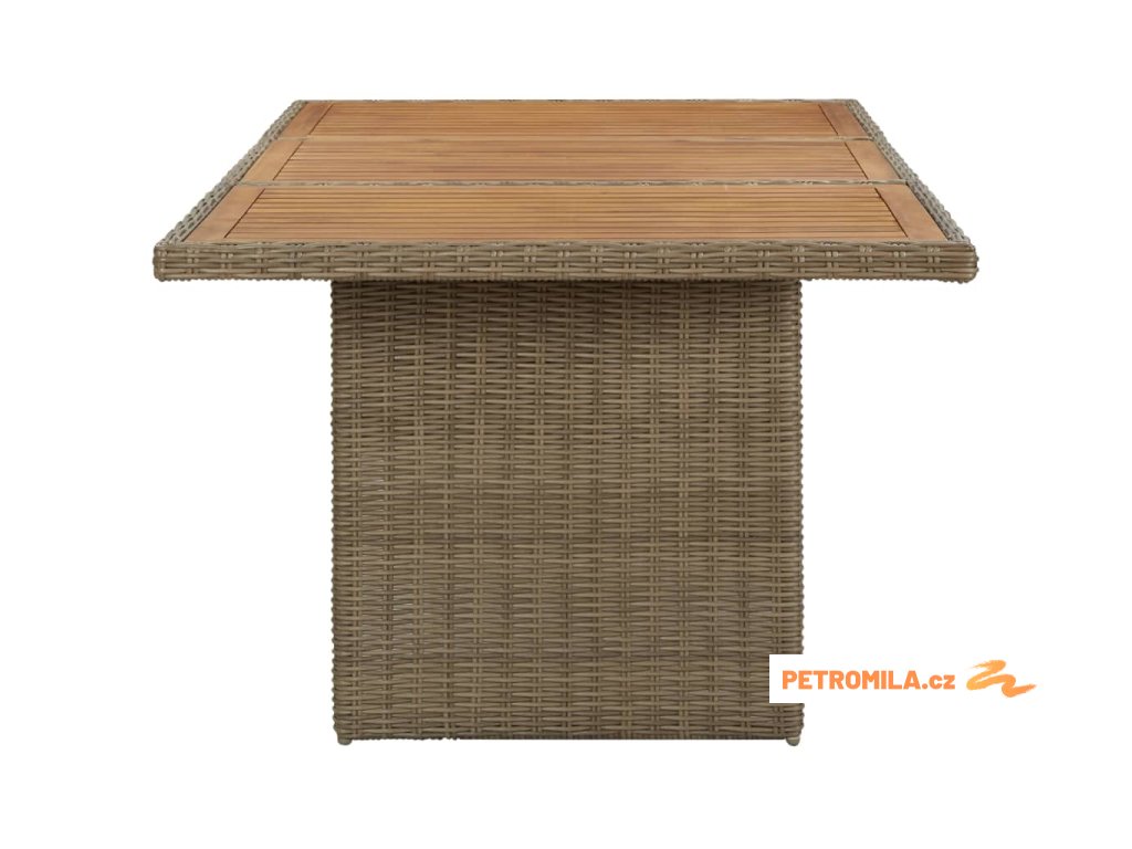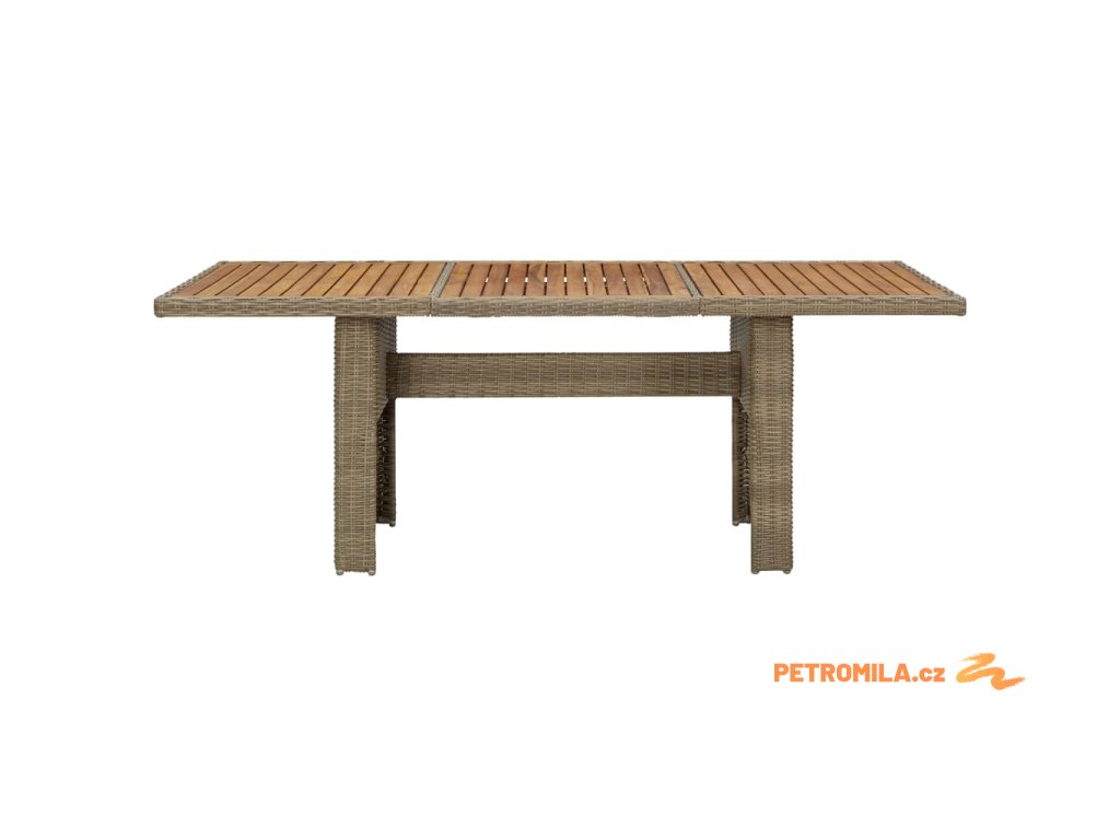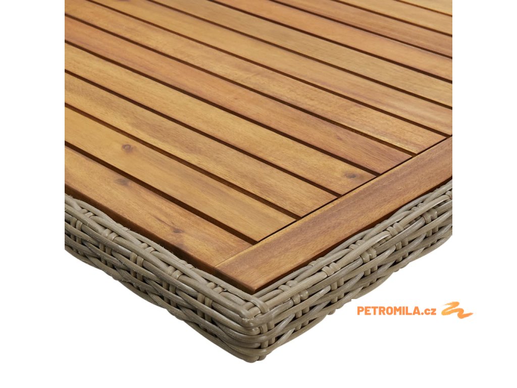 Zahradní stůl je vyrobený z PE ratanu, a proto je odolný vůči povětrnostním vlivům a má dlouhou životnost. Práškově lakovaný ocelový rám a dřevěná stolní deska z akáciového dřeva je robustní a stabilní. Stůl má lehkou konstrukci a snadno se přesouvá.