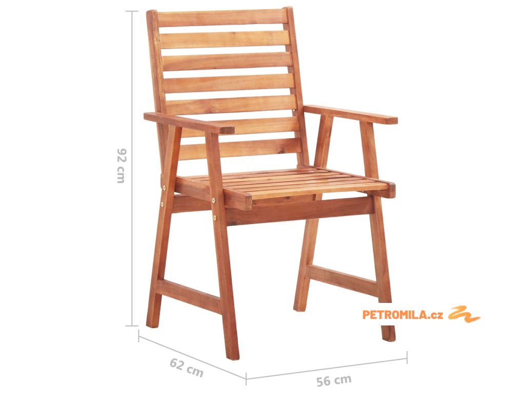 Zahradní židle jsou vyrobené z masivní akácie, tropického tvrdého dřeva, které je odolné vůči povětrnostním vlivům a vydrží vám sloužit po mnoho let. Olejem napuštěný povrch se snadno čistí vlhkým hadříkem. Laťkový design vnese do každého prostoru rustikální kouzlo. Pro ještě větší pohodlí obdržíte spolu s židlemi také podušky. Jsou vyrobené ze 100% polyesteru s voděodolnou povrchovou úpravou a každá z nich je opatřená dvěma páry šňůrek, kterými je můžete pevně přivázat k židli.