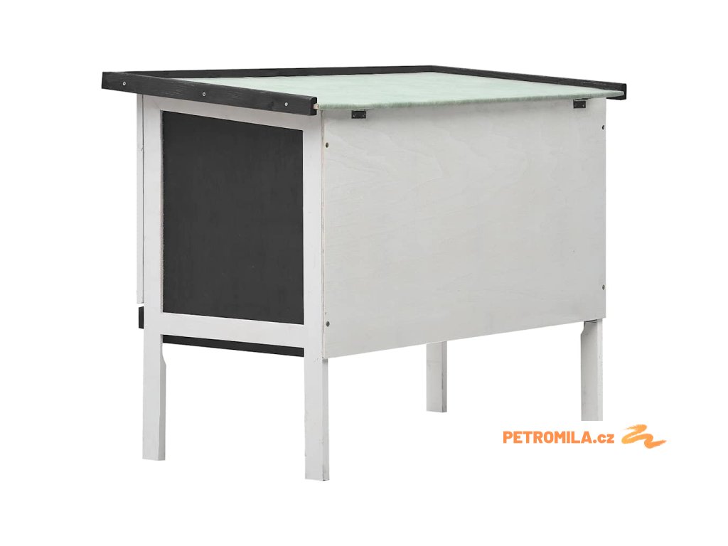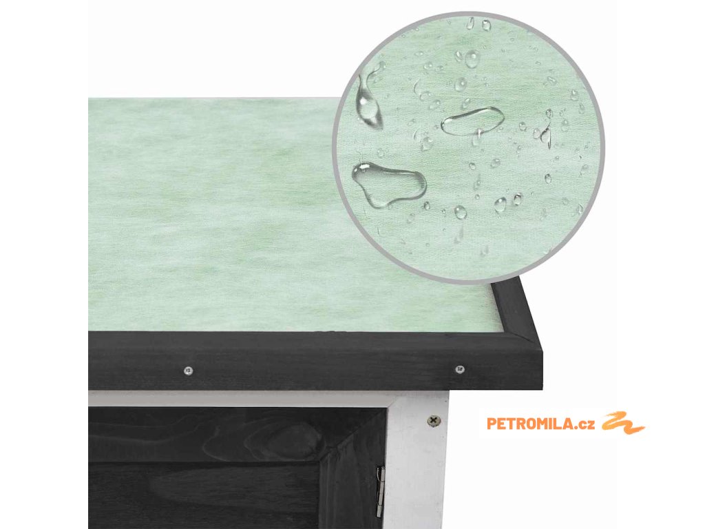 Králíkárna je vyrobena z vysoce kvalitního dřevěného rámu, takže poskytuje pevné a bezpečné přístřeší, které vydrží sloužit dlouhé roky. Její zelená asfaltová střecha nepropouští déšť a útulný pelíšek uvnitř je skvělý na spaní. Střechu můžete otevřít, abyste své domácí mazlíčky mohli snadno vyjmout nebo vrátit zpět. Výsuvný zásobník usnadňuje čištění. Dvířka se snadno zavírají a lze je zajistit posuvnou západkou.