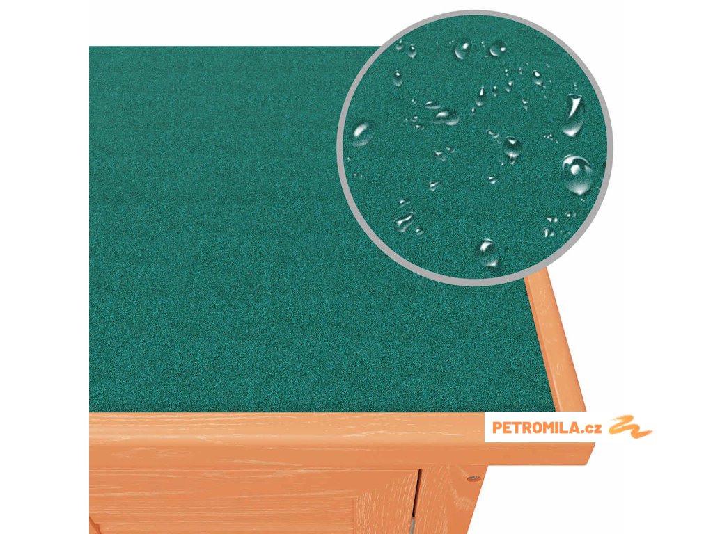 Králíkárna je vyrobena z vysoce kvalitního dřevěného rámu, takže poskytuje pevné a bezpečné přístřeší, které vydrží po celé roky. Její zelená střecha nepropouští déšť a útulný pelíšek uvnitř je skvělý na spaní. Dva výsuvné zásobníky usnadňují čištění. Dvířka se snadno zavírají a dají se zajistit posuvnou západkou.