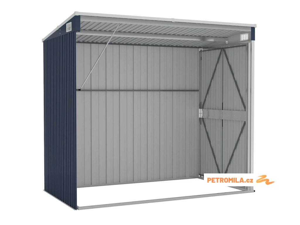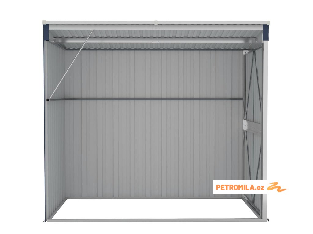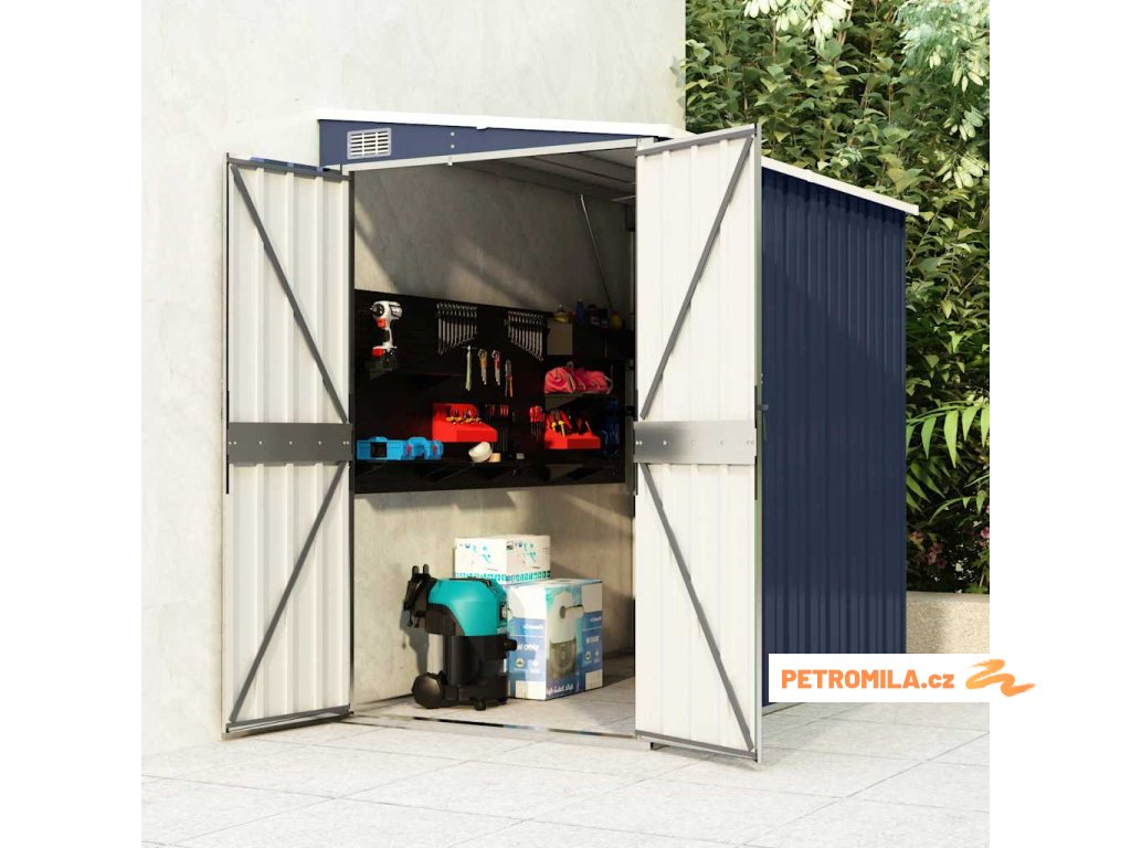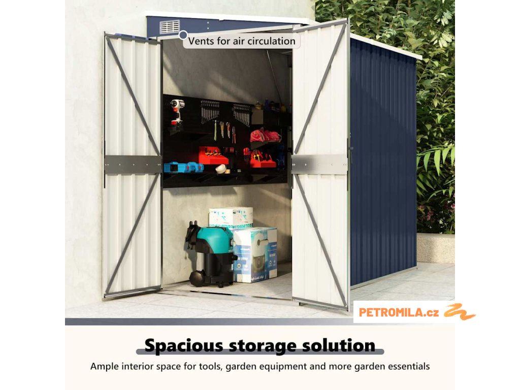 Díky tomu, že je vyroben z pozinkované oceli a kovu, vyžaduje sklad minimální údržbu a je velmi odolný. Dvojité otevírací dveře v přední části umožňují snadný vstup a výstup. Plastová rukojeť s funkcí zámku zajišťuje bezpečnost vašich věcí. Navíc dešťová voda automaticky odtéká ze střechy díky šikmé konstrukci.