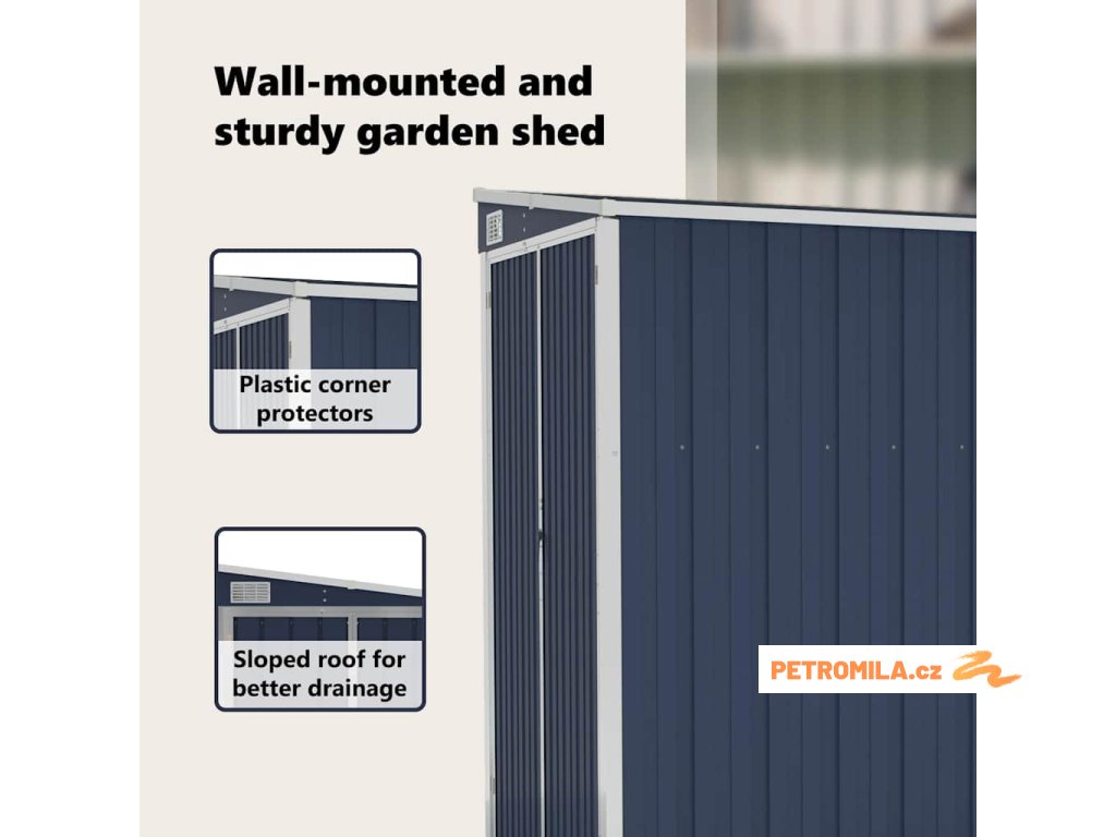 Tento nástěnný zahradní domek je ideální pro uložení různých předmětů, jako je nářadí, zahradní nábytek, zahradní vybavení atd. Domek nabízí ochranu před nečistotami, prachem a také před silným větrem a povětrnostními vlivy.