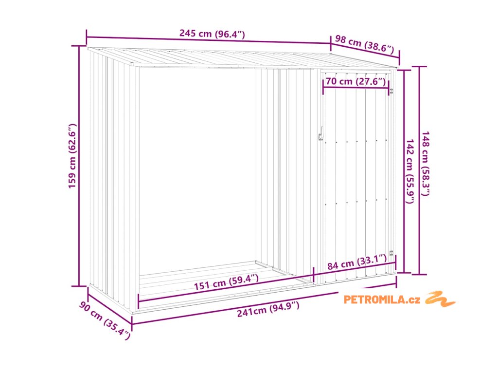 - Dostatek úložného prostoru: Tento kovový domek nabízí dostatek prostoru pro uložení palivového dřeva, zahradního nářadí, nábytku, vybavení a dalších věcí. Má také prodlouženou střechu pro uložení palivového dřeva. Střechu lze upevnit na obě strany kůlny.