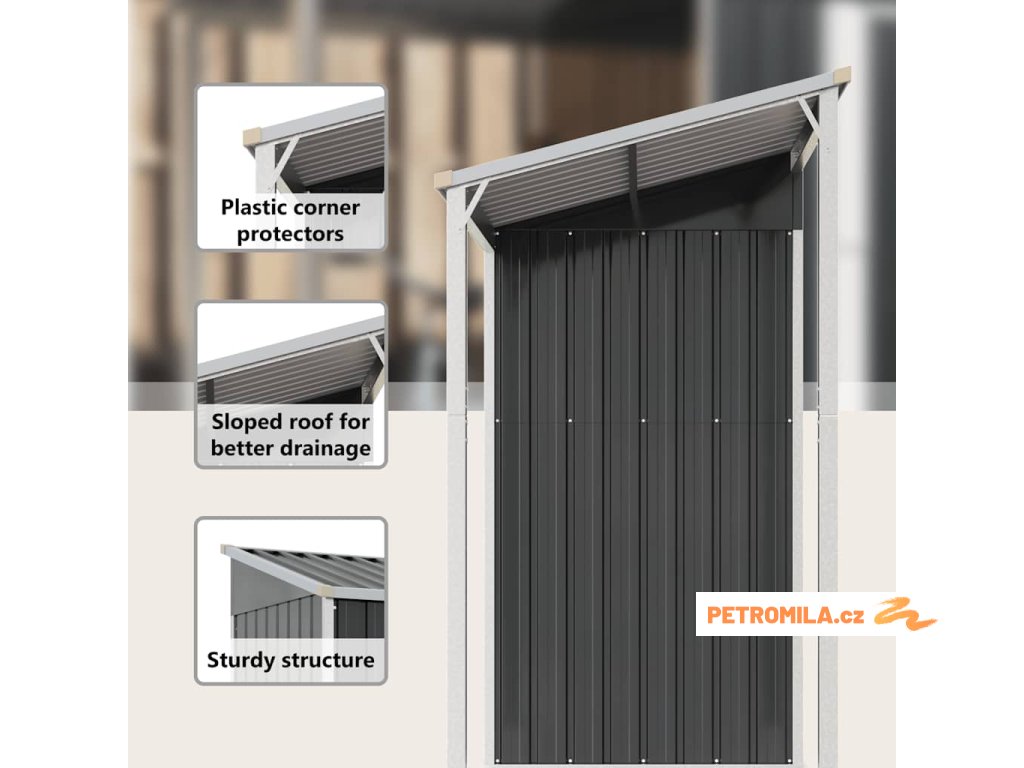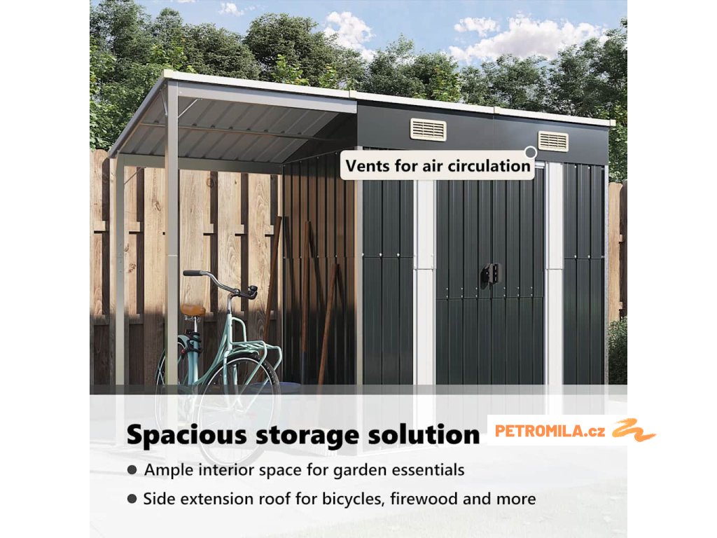 - Dostatek úložného prostoru: Tento kovový domek nabízí dostatek prostoru pro uložení palivového dřeva, zahradního nářadí, nábytku, vybavení a dalších věcí. Má také prodlouženou střechu pro uložení palivového dřeva. Střechu lze upevnit na obě strany kůlny.