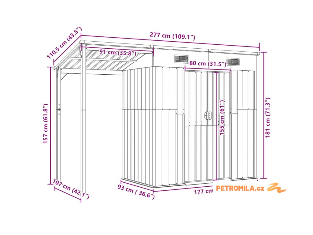 - Vnější rozměry kůlny: 177 x 93 x 157/181 cm (Š x H x V)