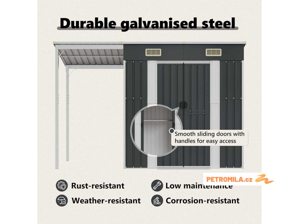 Tento robustní zahradní domek s prodlouženou střechou je ideální pro uložení široké škály předmětů, jako je nářadí, zahradní nábytek, zahradní vybavení a další.