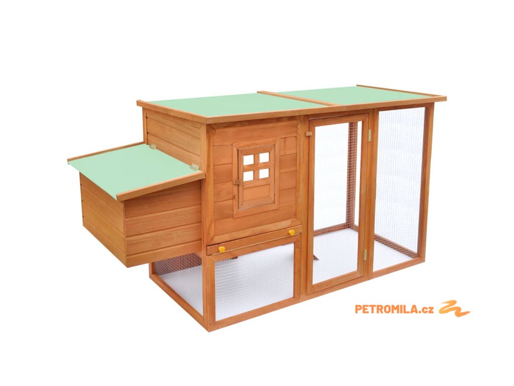 Kurník, vyrobený z vysoce kvalitního borového dřeva, vydrží dlouhá léta používání. Zelená nepromokavá střecha ochrání slepice před deštěm, takže uvnitř bude teplé a příjemné místo na odpočinek.