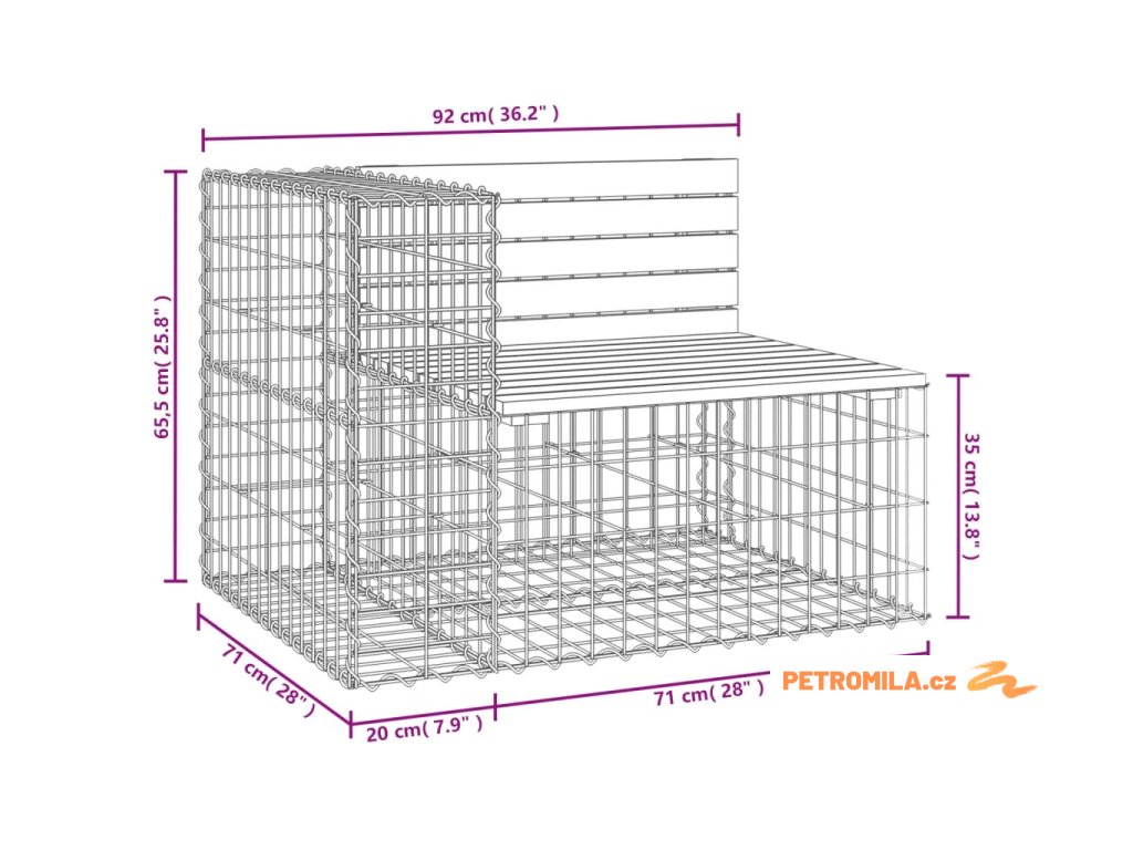- Robustní a stabilní základna: Tato venkovní lavice je vybavena základnou z pozinkovaného ocelového gabionového koše, který je navržen tak, aby jej bylo možné naplnit kameny a štěrkem pro atraktivnější vzhled. Mřížku gabionového koše tvoří podélné a svislé drátky, které jsou navíc v každém spoji svařené pro lepší stabilitu.