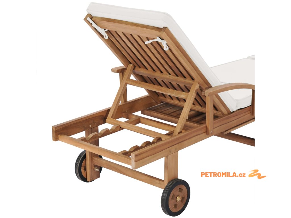 Nábytek je ošetřený lazurou, která dřevu dala krásný teplý odstín. Zahradní lehátka mají 2 kolečka, po kterých je můžete snadno přemisťovat. Spolu s lehátky obdržíte podušky, na kterých se velmi pohodlně odpočívá. Lehátkům nechybí ani praktické výsuvné stolky, na které si můžete odkládat telefon, sluneční brýle, nápoje a další drobné předměty, které chcete mít v dosahu ruky. Opěradla lehátek lze nastavit do 3 poloh, od vzpřímené polohy v sedě po zcela sklopenou polohu vleže. Podnožky jsou také nastavitelné.