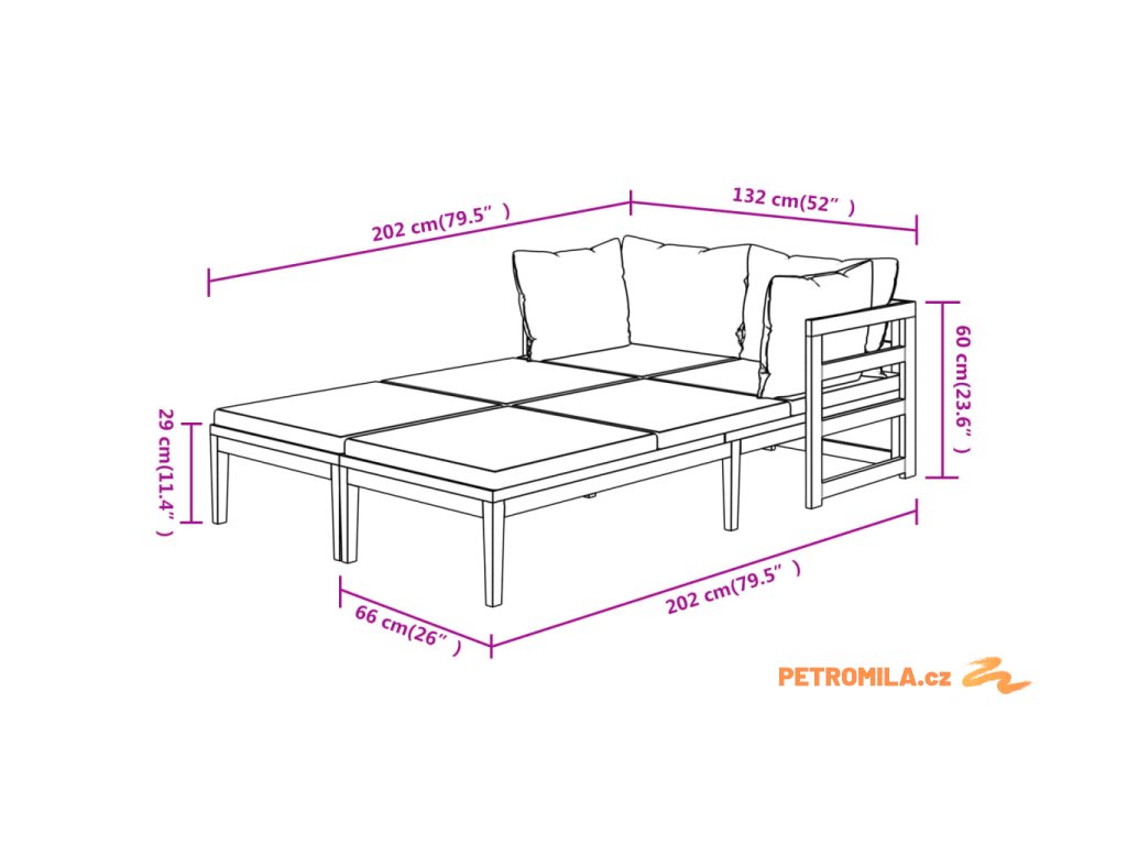 - Rozměry každého zahradního lehátka: 202 x 66 x 60 cm (D x Š x V)