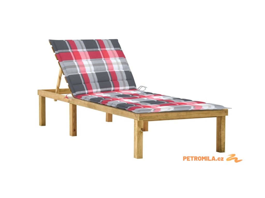 Zahradní lehátko s červenou károvanou poduškou borové dřevo
