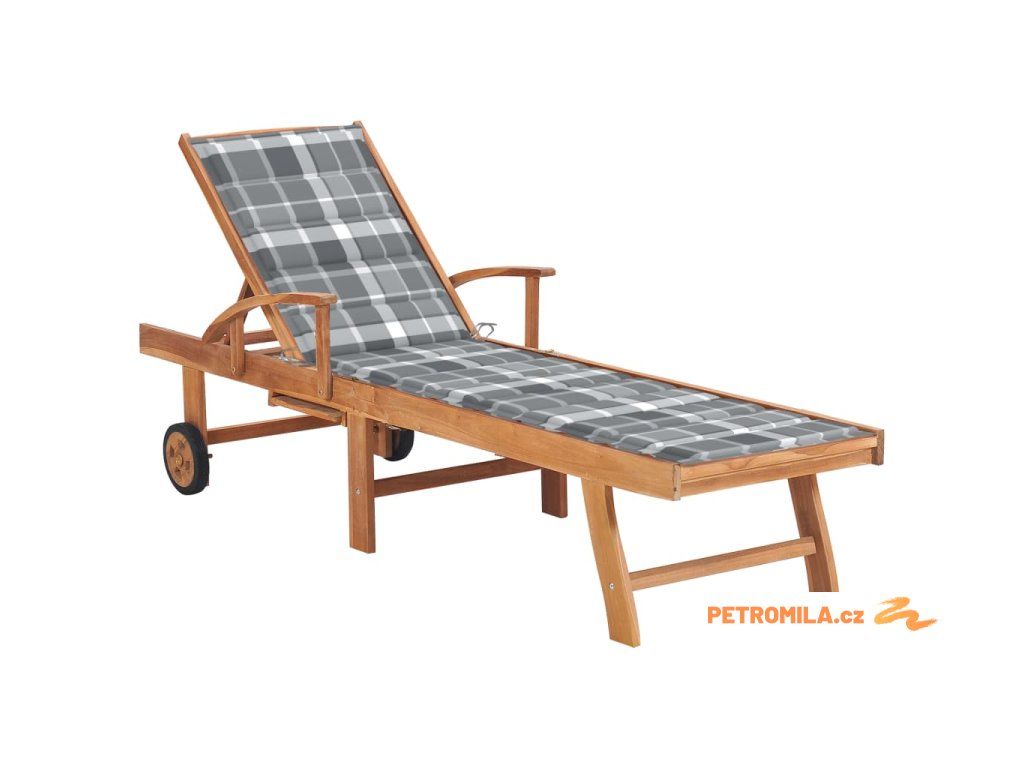 Zahradní lehátko s šedou károvanou poduškou masivní teak