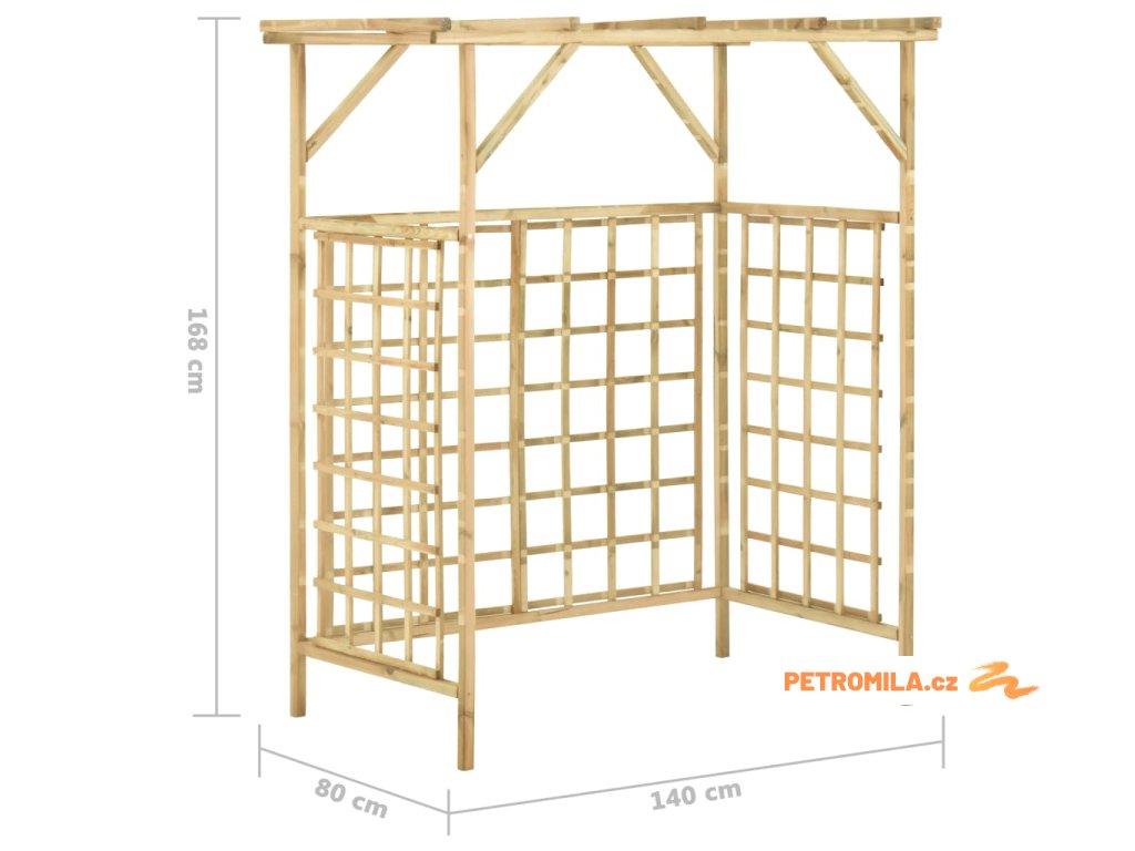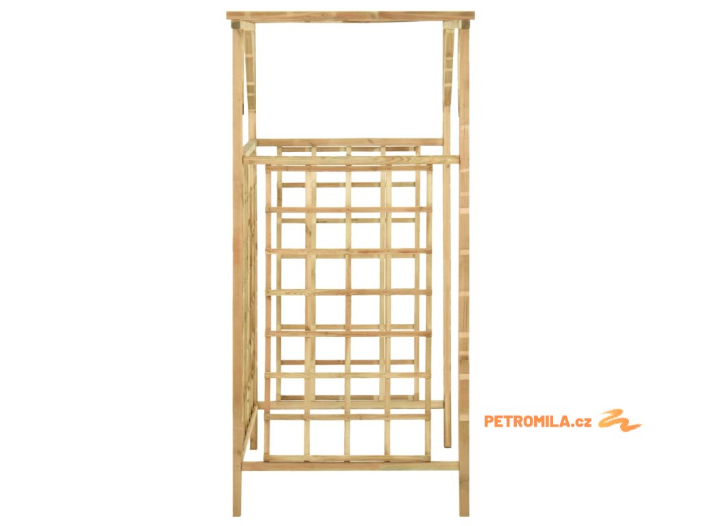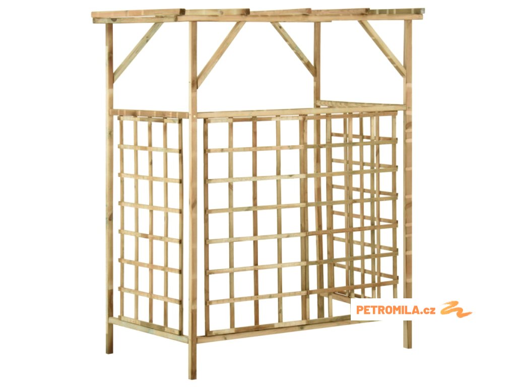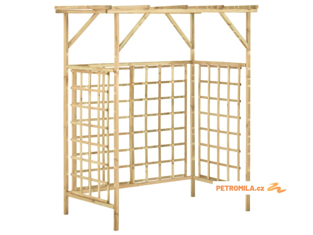 Tento dřevěný truhlík je vyrobený ze zeleného impregnovaného borového dřeva, takže je bytelný, má dlouhou životnost a je odolný proti hnilobě. Zabudovaná treláž je skvělá opora pro vaše popínavé růže nebo jiné popínavky. Pod tuto zahradní pergolu můžete umístit 2 popelnice, které krásně zakryje před pohledem ze zahrady.
