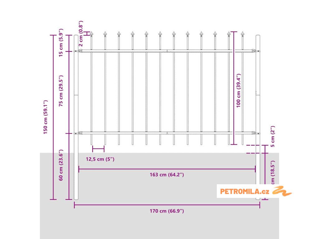 Zahradní plot s kopím nahoře černý 239 x 125 cm, práškově lakovaná ocel