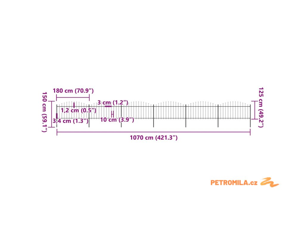 Zahradní plot s kopím nahoře ocelový 1070 x 150 cm černý